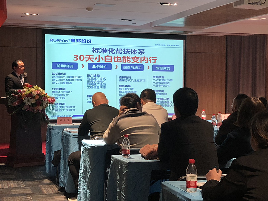 常務(wù)副總陳飛用了近90分鐘為大家全面而深刻的解析了防水修繕市場(chǎng)的背景、現(xiàn)狀和市場(chǎng)機(jī)遇,且就當(dāng)前的舊建筑物防水修繕闡明了我們的“三化”服務(wù)模式——產(chǎn)品專業(yè)化、施工標(biāo)準(zhǔn)化、售后保障化。報(bào)告了魯邦防水修繕?lè)?wù)中心三年的發(fā)展規(guī)劃,涵蓋技術(shù)研發(fā)、市場(chǎng)服務(wù)團(tuán)隊(duì)、施工技術(shù)團(tuán)隊(duì)及魯邦防水修繕?lè)?wù)中心覆蓋縣城達(dá)到1000家。