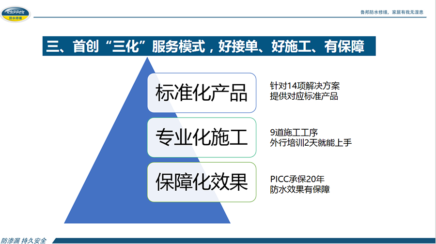 中國物業(yè)管理協會,在協助政府制定行業(yè)改革方案、發(fā)展規(guī)劃、產業(yè)政策等方面發(fā)揮重要作用并設有物業(yè)維修資金研究專業(yè)委員會。湖北魯邦建材股份有限公司在全國率先成立魯邦防水修繕服務中心,緊緊圍繞老城區(qū)、老小區(qū)作房屋防水修繕服務,切實的為廣大居民解決生活煩惱且協助物業(yè)公司與居民構建了和諧關系。探索出了一套具有魯邦特色、可持續(xù)發(fā)展的商業(yè)模式,得到物業(yè)行業(yè)的認可。幾年來,全國多地知名物業(yè)企業(yè)紛紛前來考察交流,提升了魯邦防水修繕服務中心行業(yè)對外形象。魯邦防水修繕服務中心在全國舊房防水修繕市場環(huán)境下成長為知名品牌企業(yè),建立了“三化”服務模式對行業(yè)更具有起到了帶好頭的榜樣。